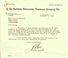 Letter on headed paper. The |Yorkshire Conservative Newspaper Company Ltd.