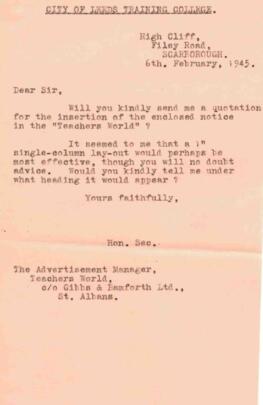 Letter to Teachers World, dated 6 February 1945
