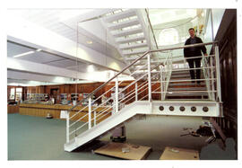 Man on mezzanine stairs.